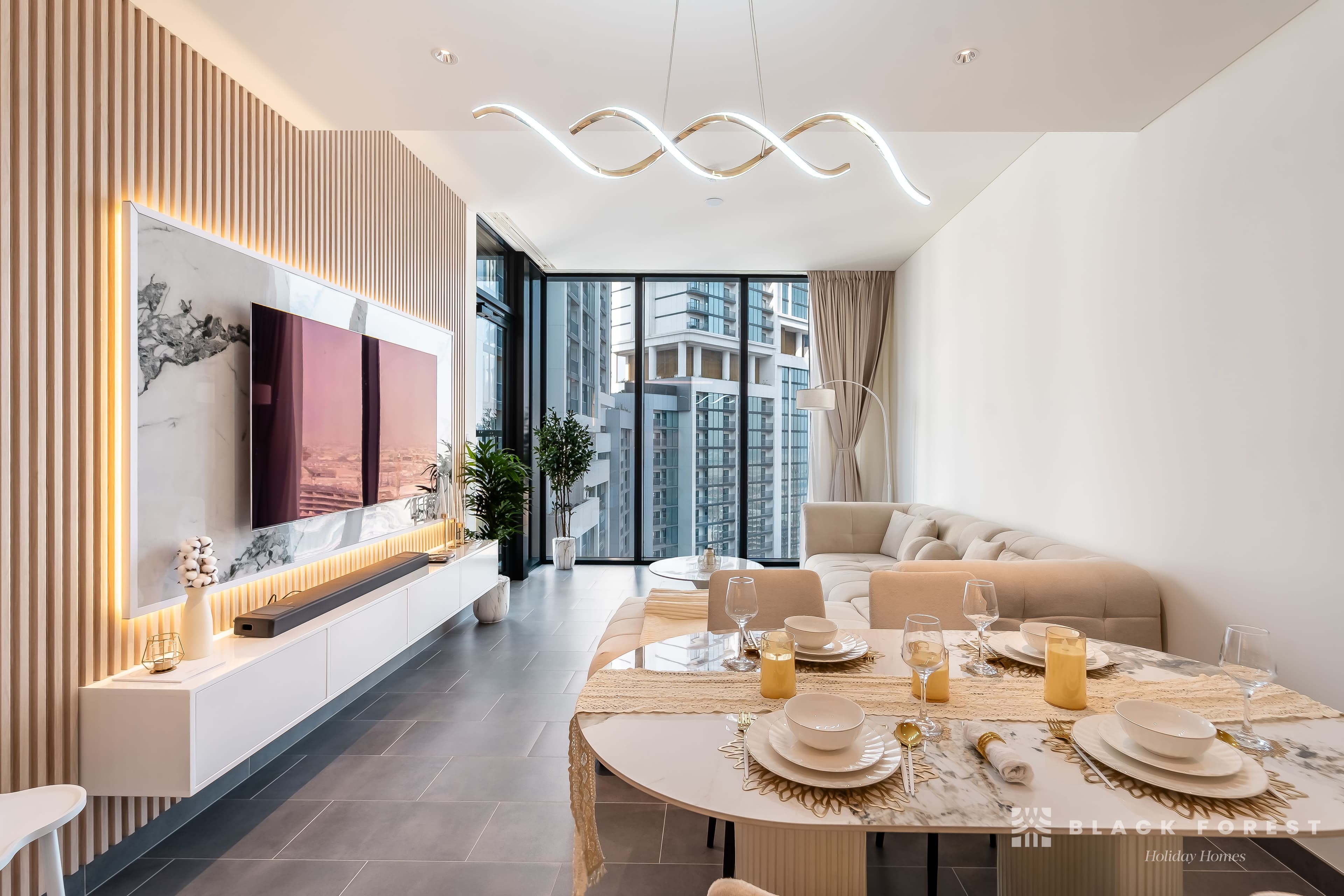 Der lichtdurchflutete Wohn- und Essbereich bildet das stilvolle Herzstück der Wohnung. Bodentiefe Fenster öffnen den Raum und schenken nicht nur einen beeindruckenden Ausblick, sondern auch direkten Zugang zum privaten Balkon. Helle Farben und moderne Designakzente verleihen dem Ambiente eine luxuriöse Leichtigkeit.