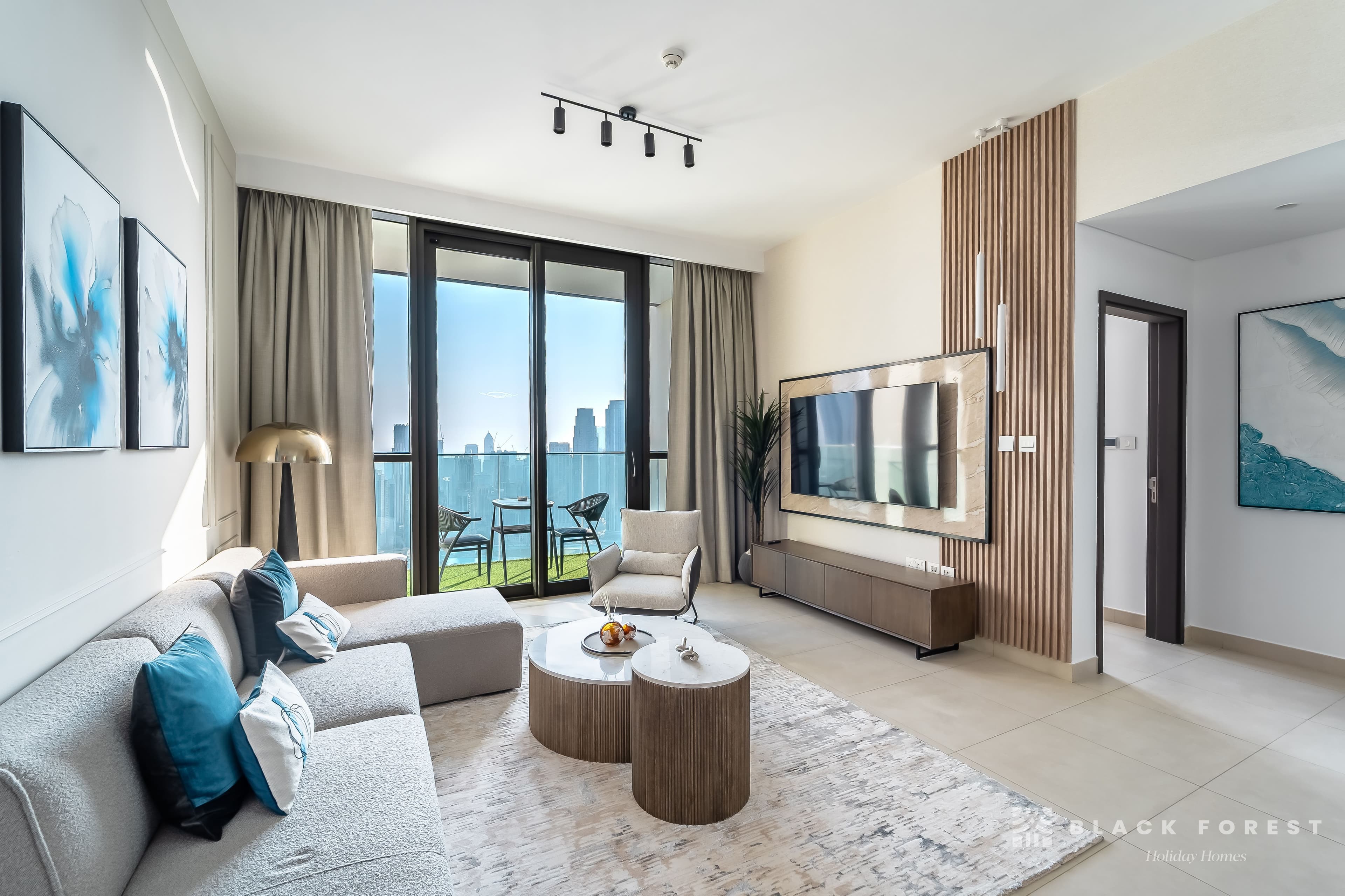 The spacious living area impresses with floor-to-ceiling windows that offer a breathtaking view of the skyline and the Burj Khalifa. Modern interiors, subtle colours and elegant details create a luxurious ambience. The cosy sofa area and the large flat-screen TV make the room the perfect place for social evenings or relaxing moments.