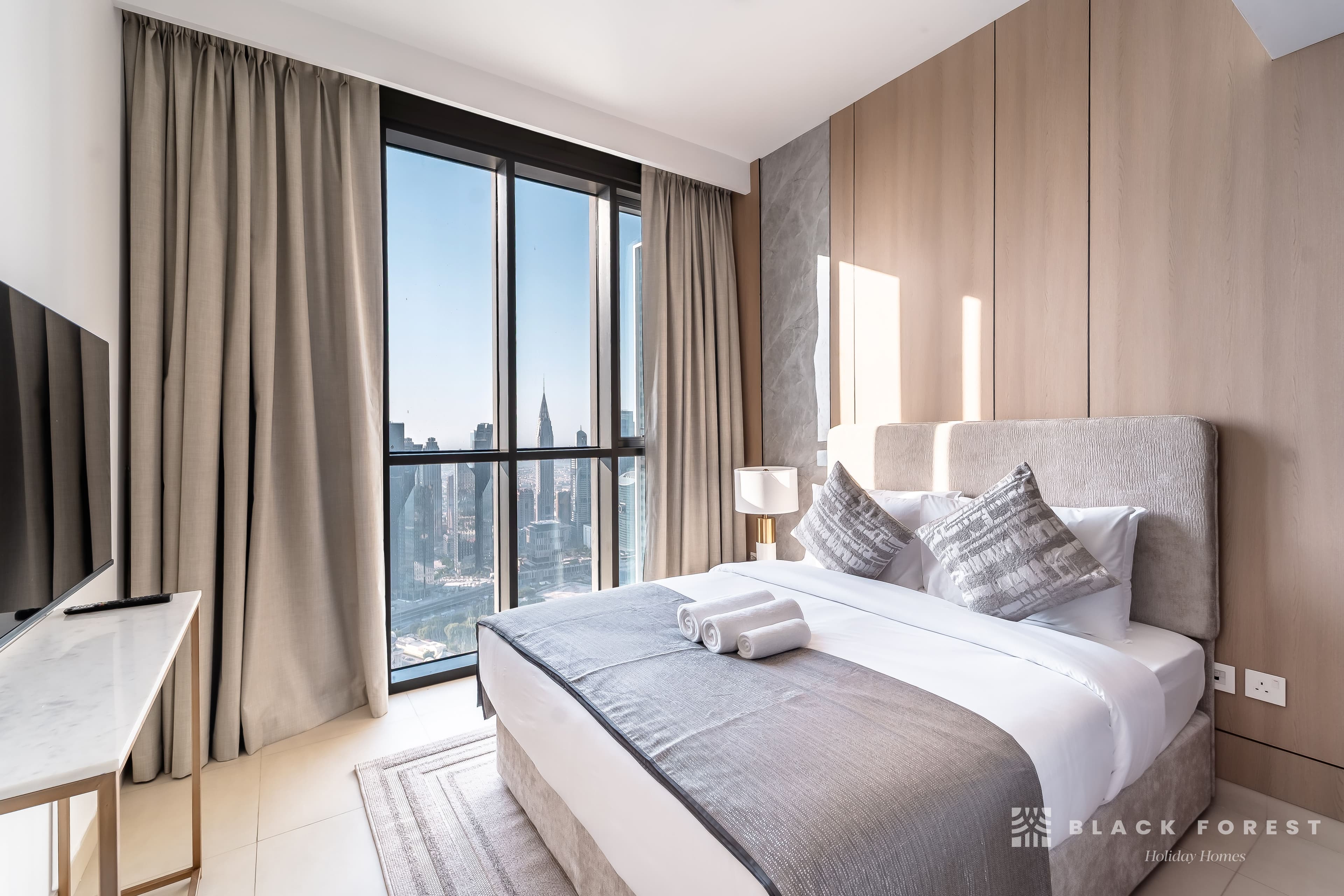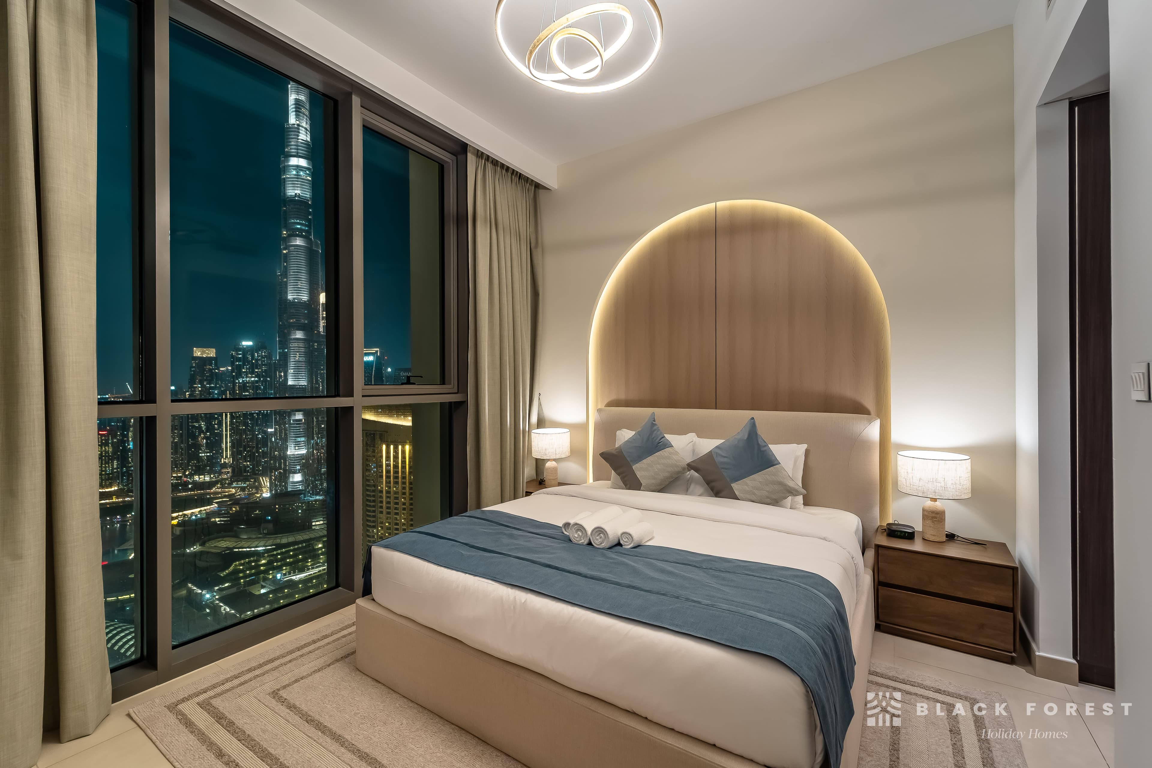 This elegant bedroom boasts floor-to-ceiling windows and a fascinating view of the glittering skyline of downtown Dubai. Whether during the day or at night – the panorama is unique. A large TV provides additional comfort, while high-quality fabrics, stylish furniture and modern design make the room another highlight.
