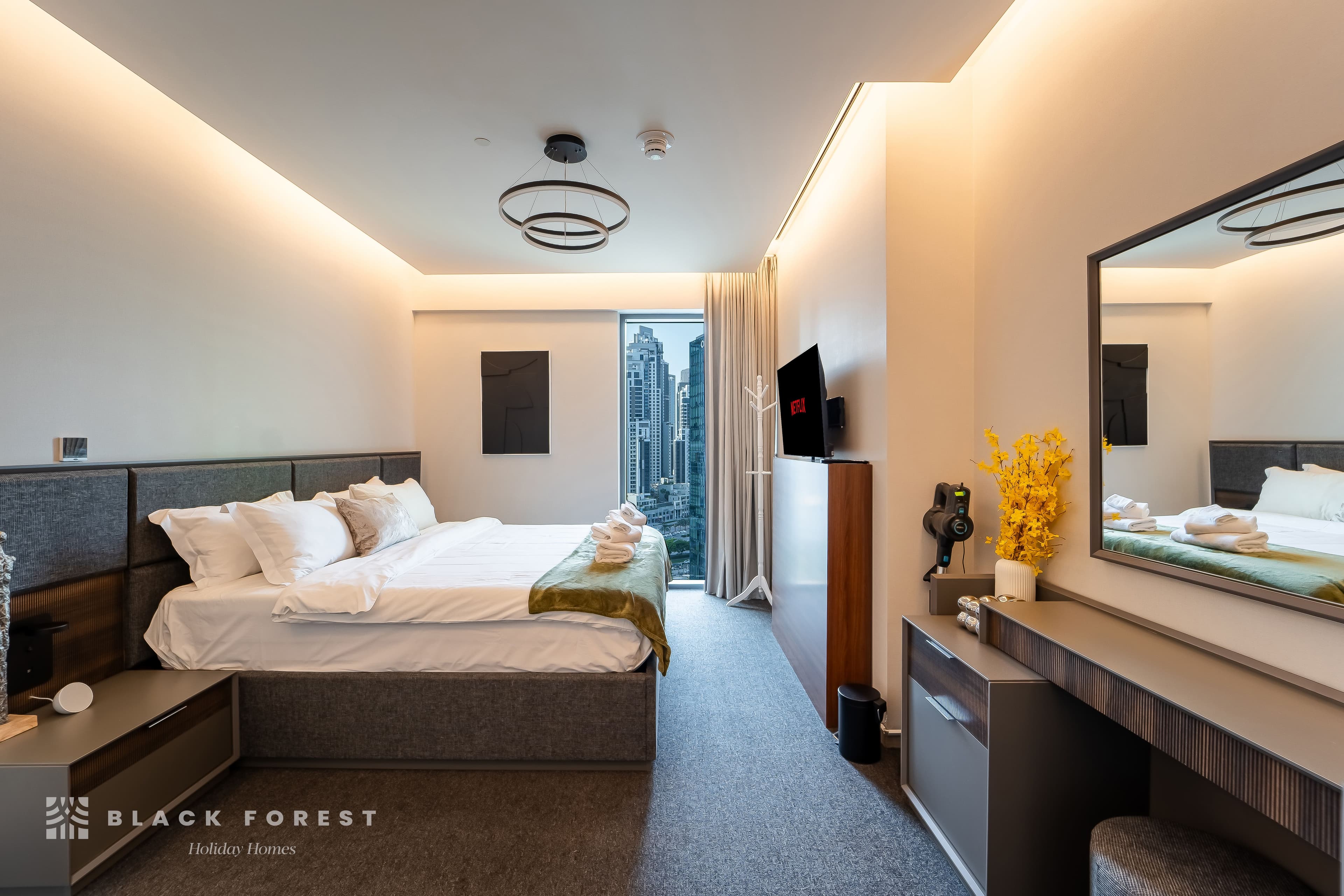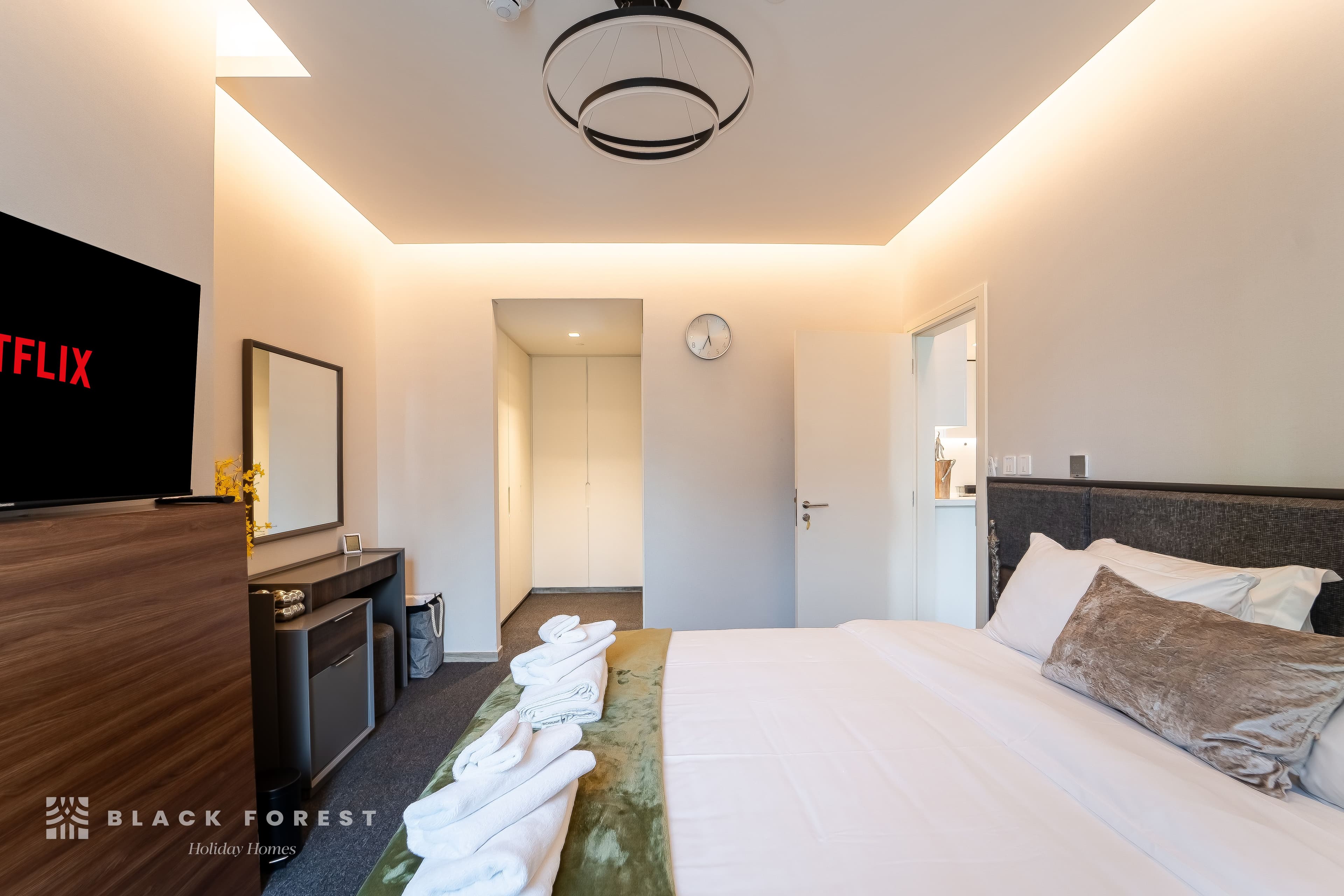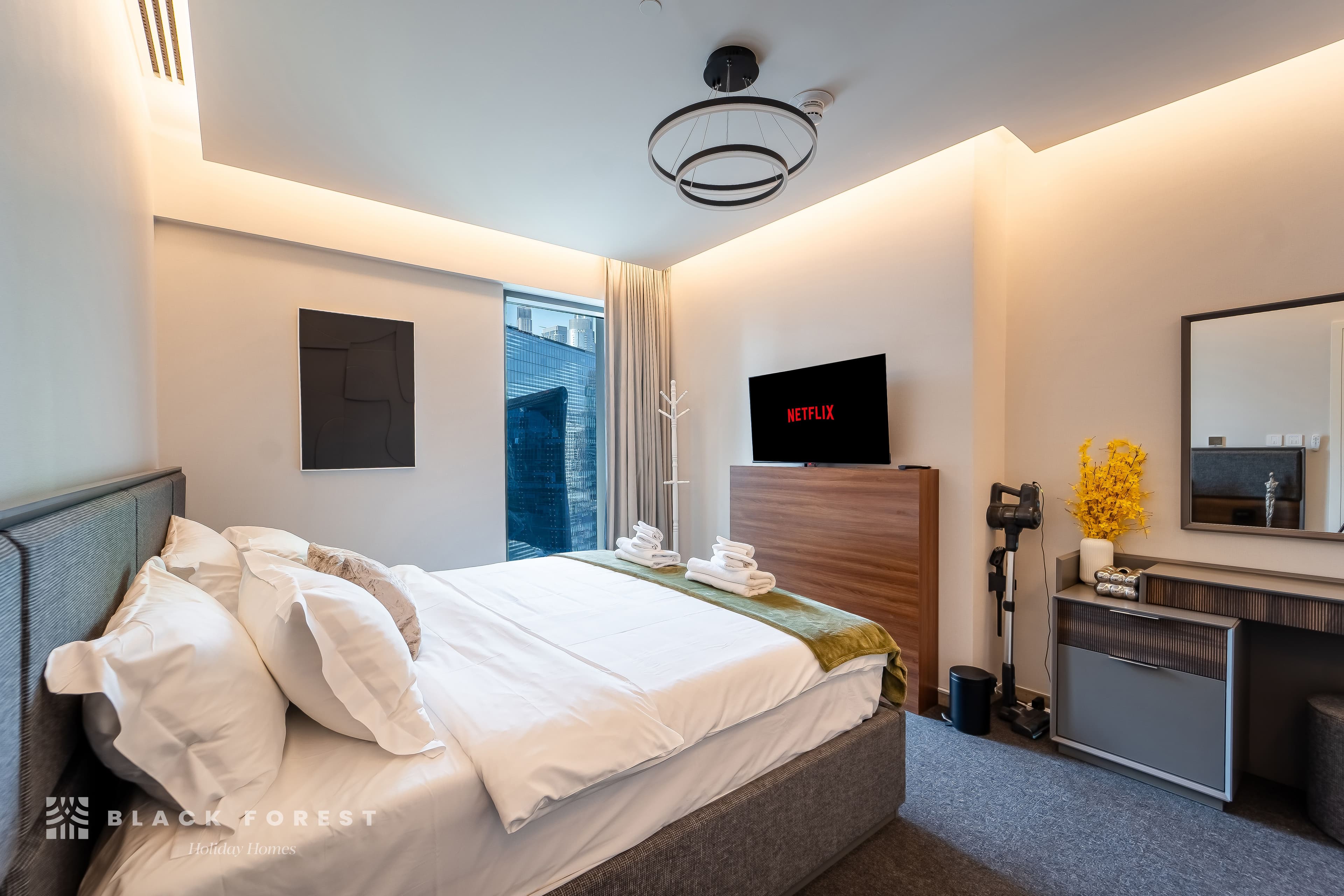 The cozy bedroom offers a luxurious king-size bed for a good night's sleep. A flat-screen TV provides entertainment, while the en-suite bathroom is equipped with a modern walk-in shower. Amenities also include wardrobes for generous storage, an elegant vanity with mirror that can also be used as a workstation, as well as an Alexa for your voice commands and adjustable light that lets you adjust the lighting as you like. Also enjoy the breathtaking view of the Burj, which is visible from this bedroom.